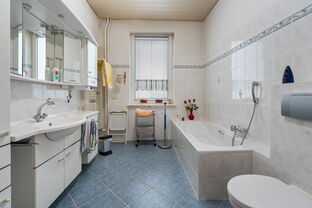Im Hochparterre befinden sich zwei helle Zimmer, die sich ideal als Schlafzimmer, Büro oder Gästezimmer eignen, sowie ein großes Badezimmer, das mit seiner Größe und Funktionalität überzeugt.
