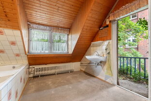 Das Obergeschoss überrascht mit einer besonderen Aufteilung: Über zwei Treppen gelangt man zum einen in einen praktischen Waschraum und zum anderen zum Dachboden. Zusätzlich verfügt die Etage über drei geräumige Schlafzimmer, einem Badezimmer mit Balkon sowie einem kleinen Waschraum, der optimal als Hauswirtschaftsbereich genutzt werden kann.