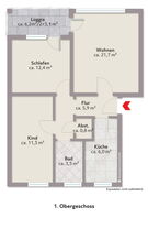 Die Wohnung überzeugt durch eine praktische Raumaufteilung: Vom Flur aus sind alle Räume direkt zugänglich. Das helle Wohnzimmer mit Zugang zur überdachten Loggia lädt zum Entspannen ein. Auch vom Schlafzimmer aus gelangen Sie direkt auf die Loggia, was zusätzlichen Komfort schafft.