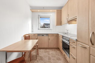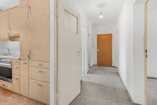 Herzstück der Wohnung ist das großzügige Wohnzimmer mit Zugang zur verglasten Loggia, ein geschützter Rückzugsort, der zu jeder Jahreszeit nutzbar ist. Die Küche ist mit einer zeitlosen, sehr gepflegten Einbauküche samt Elektrogeräten ausgestattet und bietet alles, was man zum Kochen und Genießen braucht.