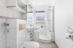 Das hell geflieste Badezimmer mit Fenster überzeugt mit einer intelligenten Kombination aus Badewanne und Dusche. Eine integrierte Duschtür ermöglicht einen bequemen und sicheren Einstieg in den Bade- und Duschbereich, nahezu bodeneben und besonders komfortabel. So genießen Sie maximale Flexibilität, egal ob Sie sich für ein entspannendes Bad oder eine erfrischende Dusche entscheiden. Ein Fenster sorgt zusätzlich für Tageslicht und eine angenehme Belüftung. Ein zusätzlicher Abstellraum sorgt für Ordnung und Stauraum im Alltag.