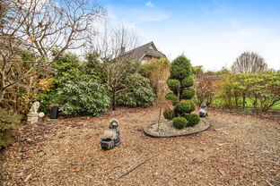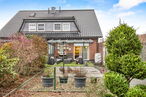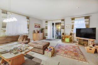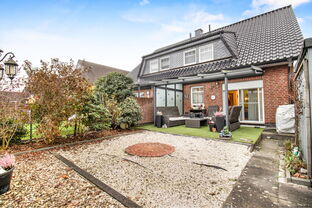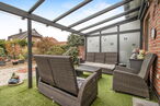 Vom Wohnzimmer aus gelangt man direkt auf die mit Echtglas überdachte Terrasse, die zu fast jeder Jahreszeit gut genutzt werden kann. Daran schließt sich ein schön angelegter Garten an, der sowohl Raum für Erholung als auch für Spiel und Freizeit bietet.