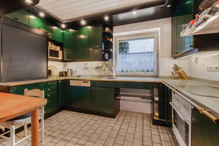 Im Erdgeschoss befindet sich der Mittelpunkt des Hauses: ein großzügiges Wohnzimmer mit Kamin, das durch den angrenzenden Wintergarten und den Zugang zur Sonnenterrasse besonders wohnlich wirkt. Hier lässt sich der Blick ins Grüne genießen – perfekt für entspannte Nachmittage oder gesellige Abende. Ergänzt wird die Ebene durch eine Küche, eine großzügige Diele, ein Gäste-WC sowie ein weiteres Zimmer, das sich ideal als Arbeits- oder Gästezimmer eignet.