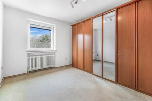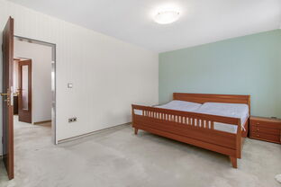 Über die Treppe gelangt man in das Obergeschoss, wo sich drei Schlafzimmer sowie ein Badezimmer befinden. Das großzügige Elternschlafzimmer bietet ausreichend Platz für ein großes Bett und zusätzliche Möbel, während die beiden weiteren Zimmer ideal als Kinder-, Gäste- oder Arbeitszimmer genutzt werden können.