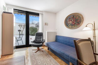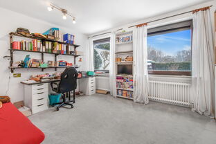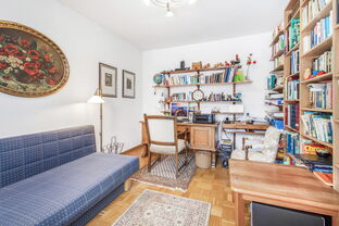 Das Wohnzimmer bietet ein angenehmes Raumgefühl. Angrenzend befindet sich ein derzeit als Büro genutztes Durchgangszimmer. Da es sich um eine Leichtbauwand handelt, besteht die Möglichkeit, den Wohnbereich bei Bedarf zu öffnen und großzügiger zu gestalten.