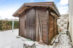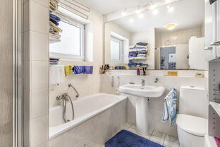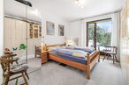 Der Schlaftrakt umfasst zwei Schlafzimmer, eines davon mit direktem Zugang in den Garten. Ein weiteres Zimmer, mit großer Fensterfront, sorgt für viel Tageslicht. Das Badezimmer ist mit einer Badewanne, einer Dusche und einem Fenster ausgestattet.
