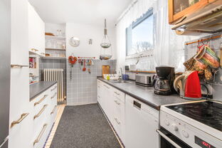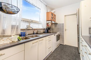 Die Küche mit Fensterfront sowie ein separater Hauswirtschaftsraum mit Waschmaschinenanschluss ergänzen das Raumangebot. Zusätzliche Nutzfläche bietet der Hochkeller mit eigenem Außenzugang.