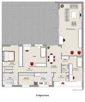 Beim Betreten empfängt Sie eine großzügige Essdiele, die als zentraler Verteiler dient. Von hier aus gelangen Sie in das helle Wohnzimmer, auf die Terrasse, in den Schlafbereich sowie in die weiteren Nebenräume.