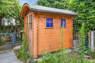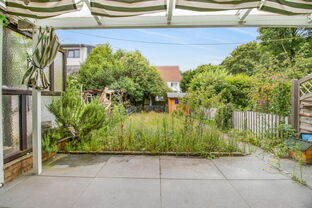 Die überdachte Terrasse und der gepflegte Garten mit Gartenhaus versprechen entspannte Stunden im Freien – ob beim Spielen, Sonnen, Grillen oder einfach beim Entspannen: Hier ist alles möglich.
