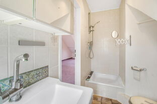 Das Dachgeschoss mit zwei Erkern ist vollständig ausgebaut und umfasst ein großes, helles Zimmer sowie ein Duschbad.