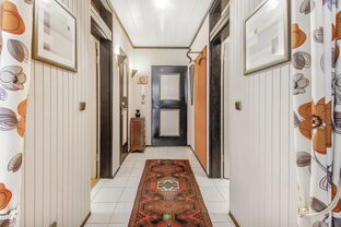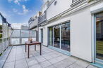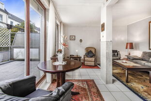Die breite Fensterfront im Wohnbereich ist mit elektrischen Rollläden ausgestattet und öffnet sich direkt auf die sonnige Süd/West-Terrasse. Mit rund 24,5 m² Fläche und einer Markise bietet sie viel Platz für entspannte Stunden im Freien und erweitert den Wohnbereich besonders in den Sommermonaten.