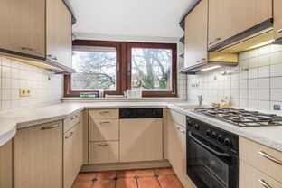 Die Küche ist mit einer gepflegten Einbauküche ausgestattet und verfügt über eine erhöhte Arbeitsplatte, die komfortables Kochen und Vorbereiten ermöglicht. Das hell geflieste Badezimmer ist mit einem Fenster ausgestattet und sorgt für eine angenehme Belichtung und Belüftung.