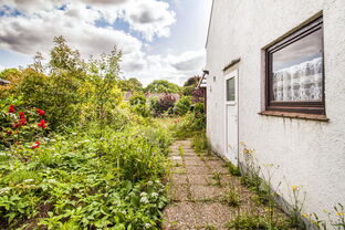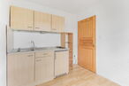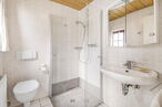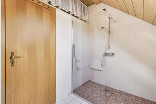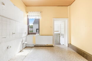 Geradeaus gelangt man in die Küche, die einen direkten Zugang zum gepflegten Garten bietet. Von hier aus erreicht man auch das modernisierte Tageslichtbad mit bodentiefer Dusche. Ebenfalls über den Flur zugänglich ist der praktische Teilkeller, der zusätzlichen Stauraum bietet.