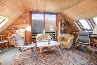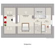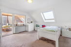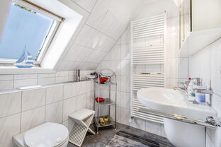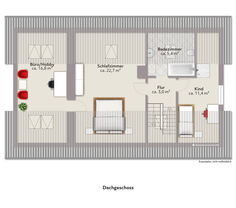 Im Dachgeschoss befinden sich mehrere Schlaf- und Nutzräume. Rechts liegt das Schlafzimmer/Kinderzimmer mit großer Dusche, geradeaus das geräumige Badezimmer. Links befindet sich ein großes Elternschlafzimmer. Ein zusätzlich ausgebauter Bereich wird derzeit als großzügiger Ruhe- bzw. Hobbyraum genutzt und bietet vielfältige Nutzungsmöglichkeiten.
