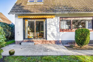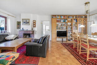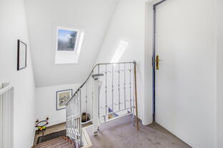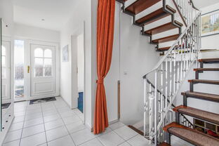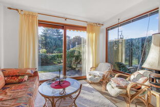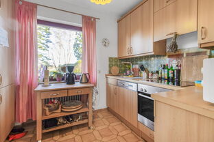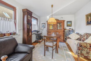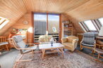 Vom Wohnzimmer aus gelangt man in einen ausgebauten Ruhebereich/Wintergarten, der einen direkten Zugang zur Südterrasse bietet. Der Flur führt weiter zum Treppenhaus, welches sowohl den Zugang zum Vollkeller als auch zum Dachgeschoss ermöglicht.