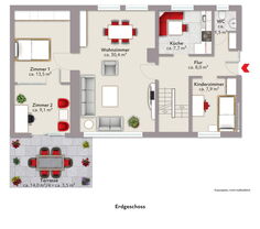 Das Haus überzeugt durch eine durchdachte Raumaufteilung und vielseitige Nutzungsmöglichkeiten. Über die Auffahrt gelangt man in den Hauseingang. Im Erdgeschoss befindet sich direkt auf der linken Seite ein separates Garderobenzimmer, auf der rechten Seite das Gäste-WC. Geradeaus öffnet sich der Zugang zum großzügigen Wohnzimmer, während sich rechts davon die Küche befindet.