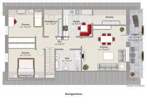 Das Dachgeschoss wurde bis vor kurzem vermietet und bietet einen separaten Eingang. Die knapp 80 m² umfassen ein großes Wohnzimmer mit Balkon, ein Schlafzimmer, ein Wannenbad mit Fenster und eine Küche.