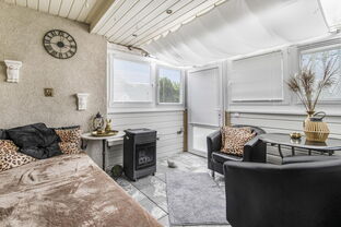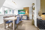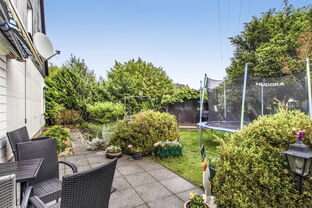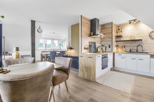 Das Erdgeschoss umfasst ein großes Wohn-und Esszimmer mit offener Küche, zwei Schlafzimmer, ein Duschbad, ein großer Wintergarten sowie ein eigener Gartenanteil.