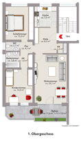 Beim Betreten der Wohnung gelangt man vom Treppenhaus in die Diele. Auf der rechten Seite befindet sich die Küche, während sich auf der linken Seite das großzügige Wohnzimmer anschließt, welches direkten Zugang zum Balkon bietet. Ebenfalls angrenzend an den Wohnbereich befindet sich ein praktischer Abstellraum.