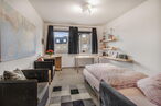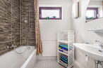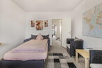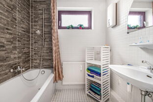 Folgt man der Diele weiter, erreicht man den Flur, von dem aus sämtliche weiteren Räume zugänglich sind. Hierzu zählen ein Kinderzimmer bzw. Büro, das Elternschlafzimmer, das Badezimmer sowie ein separates Gäste-WC. Die Raumaufteilung ist funktional und bietet vielseitige Nutzungsmöglichkeiten für Paare, kleine Familien oder auch das Arbeiten im Homeoffice.