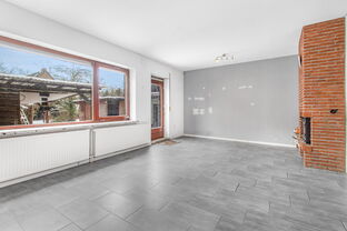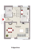 Der seitliche Hauseingang führt in einen Windfang und weiter in den Flur. Rechter Hand befindet sich das großzügige Wohnzimmer mit Kamin und direktem Zugang zur Terrasse und Garten. Geradeaus liegt die Küche, links das Badezimmer sowie der Zugang zum Dach- und Kellergeschoss.