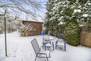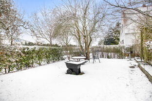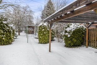 Das Grundstück bietet zwei separate Gartenbereiche: einen vorderen Garten direkt an der Terrasse sowie einen größeren hinteren Garten, erreichbar über die Auffahrt zur Garage und zum Carport.