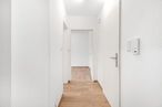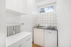 Direkt angrenzend befindet sich die Küche, die mit einer weißen Pantryküche ausgestattet ist.