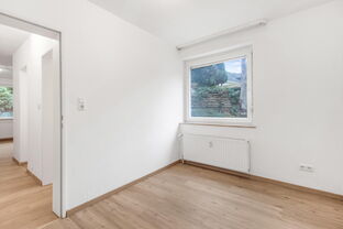 Das Schlafzimmer ist ebenfalls mit einem Fenster versehen und wird dadurch optimal mit Tageslicht versorgt. Es bietet ausreichend Platz für ein Bett sowie einen Kleiderschrank.