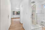 Das Badezimmer ist zeitlos weiß gefliest und verfügt über eine moderne Rainbow-Dusche, ein WC sowie ein Waschbecken.