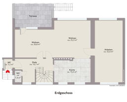 Erdgeschoss: Hier befinden sich das geräumige Wohnzimmer, ein Esszimmer und ein weiteres Zimmer sowie eine gut ausgestattete Einbauküche, die durch ihre funktionale Gestaltung und den direkten Zugang zum Essbereich besticht. Ein Gäste-WC sorgt für zusätzlichen Komfort.