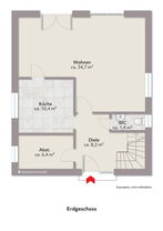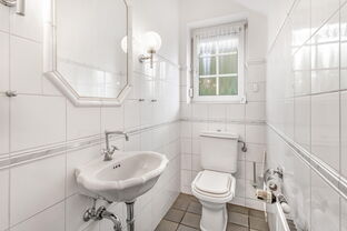 Die vollausgestattete Küche bietet ausreichend Platz für einen kleinen Esstisch – perfekt, um gemütlich in den Tag zu starten. Ein Gäste-WC mit hochwertigen Armaturen, sowie ein praktischer Hauswirtschaftsraum mit Waschmaschinenanschluss ergänzen das Raumangebot im Erdgeschoss.
