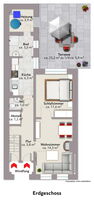 Im Erdgeschoss befinden sich ein Wohnzimmer mit angrenzendem Schlafzimmer, ein Gäste-WC, ein Abstellraum sowie die Küche, das Badezimmer und Heizungsraum. Von dem Heizungraum aus gelangt man direkt auf die Terrasse beziehungsweise in den Garten mit angrenzenden Schuppen.