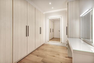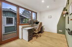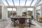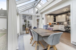 Die angrenzende Küche ist mit einer modernen, weißen Einbauküche mit Hochglanzfronten und hochwertigen Elektro-Markengeräten aus dem Jahr 2021 ausgestattet. Von hier aus gelangen Sie direkt in den Wintergarten, der einen schönen Blick in den liebevoll angelegten Vordergarten eröffnet und zu jeder Jahreszeit ein besonderer Rückzugsort ist.