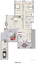 Beim Betreten des Hauses gelangen Sie in den einladenden Eingangs- und Flurbereich, von dem aus alle Räume bequem erreichbar sind. Das Herzstück des Hauses bildet der Wohnbereich, der dank einer großen Fensterfront optimal mit Tageslicht versorgt wird. Der Kamin sorgt auch an kalten Wintertagen für eine angenehme Wohlfühlatmosphäre.