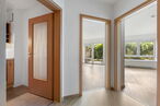 Die Wohnung ist so konzipiert, dass alle Räume bequem vom zentralen Flur aus erreichbar sind. Auf der linken Seite befindet sich eine geräumige Einbauküche. Rechts vom Flur liegt das moderne Badezimmer mit einer bodengleichen Dusche. Geht man den Flur weiter, gelangt man auf der linken Seite in das helle Wohnzimmer, das durch große Fenster und den direkten Zugang zur großzügigen Süd-West-Terrasse begeistert – ein perfekter Ort für erholsame Stunden im Freien. Auf der rechten Seite des Flurs befindet sich das gemütliche Schlafzimmer, das ebenfalls ausreichend Raum für individuelle Gestaltung bietet.