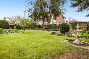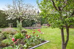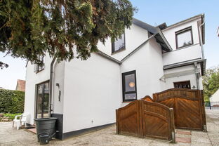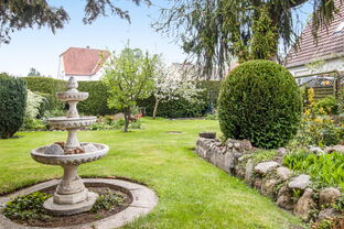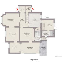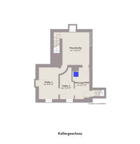 Die untere Wohnung (ca. 120 qm) umfasst zwei Wohnzimmer, ein Schlafzimmer, ein Wannenbad/WC, Veranda, Wintergarten, Küche mit Speisekammer sowie ein Gäste-Studio mit Duschbad/WC im Anbau. Der Zugang zu den Kellerräumen erfolgt direkt vom Flur.