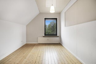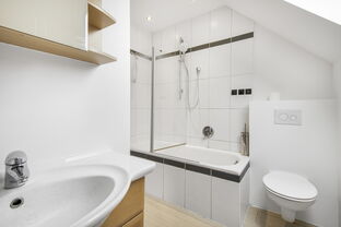 Die obere Wohnung (ca. 80 qm) verfügt über ein Wohnzimmer, zwei Schlafzimmer, eine Einbauküche und ein Wannenbad/WC. Der geschlossene Balkon kann als Wintergarten oder Atelier genutzt werden. Der ausbaufähige Dachboden eignet sich ideal als Spiel- oder Gästezimmer.